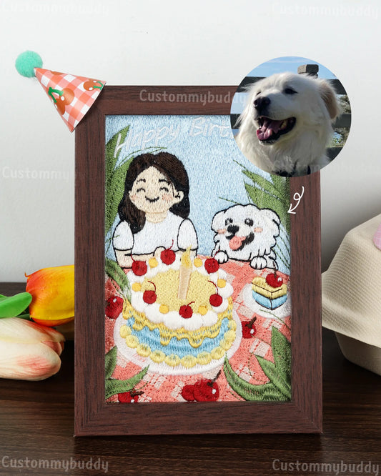 Realistic Custom Pet Portrait Embroidery in Walnut Frame