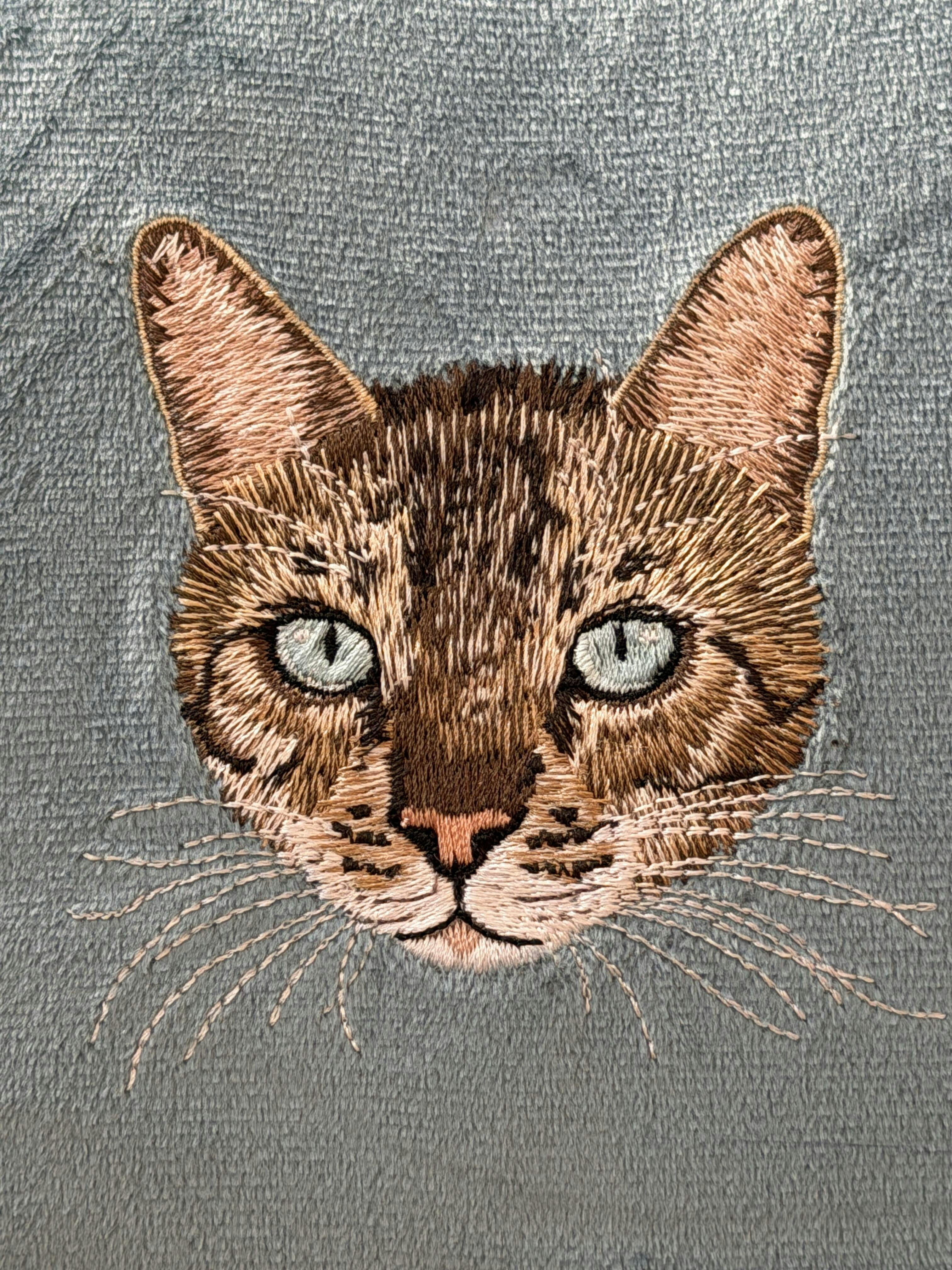 Every Pet Portrait is a 1 of 1 hyper-realistic embroidered art piece with 25,000+ stitches, 15+ thread colors, and hand drawn art
