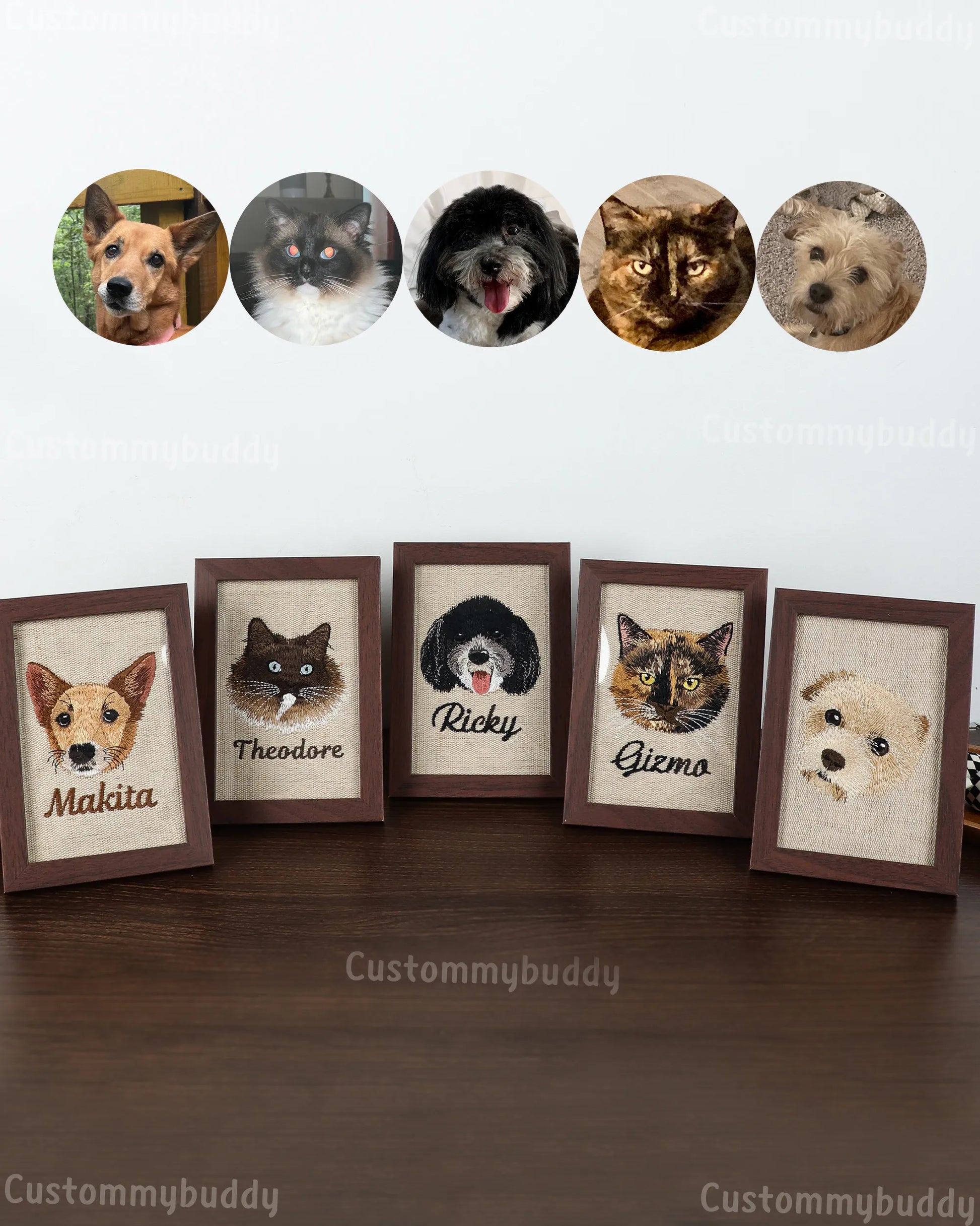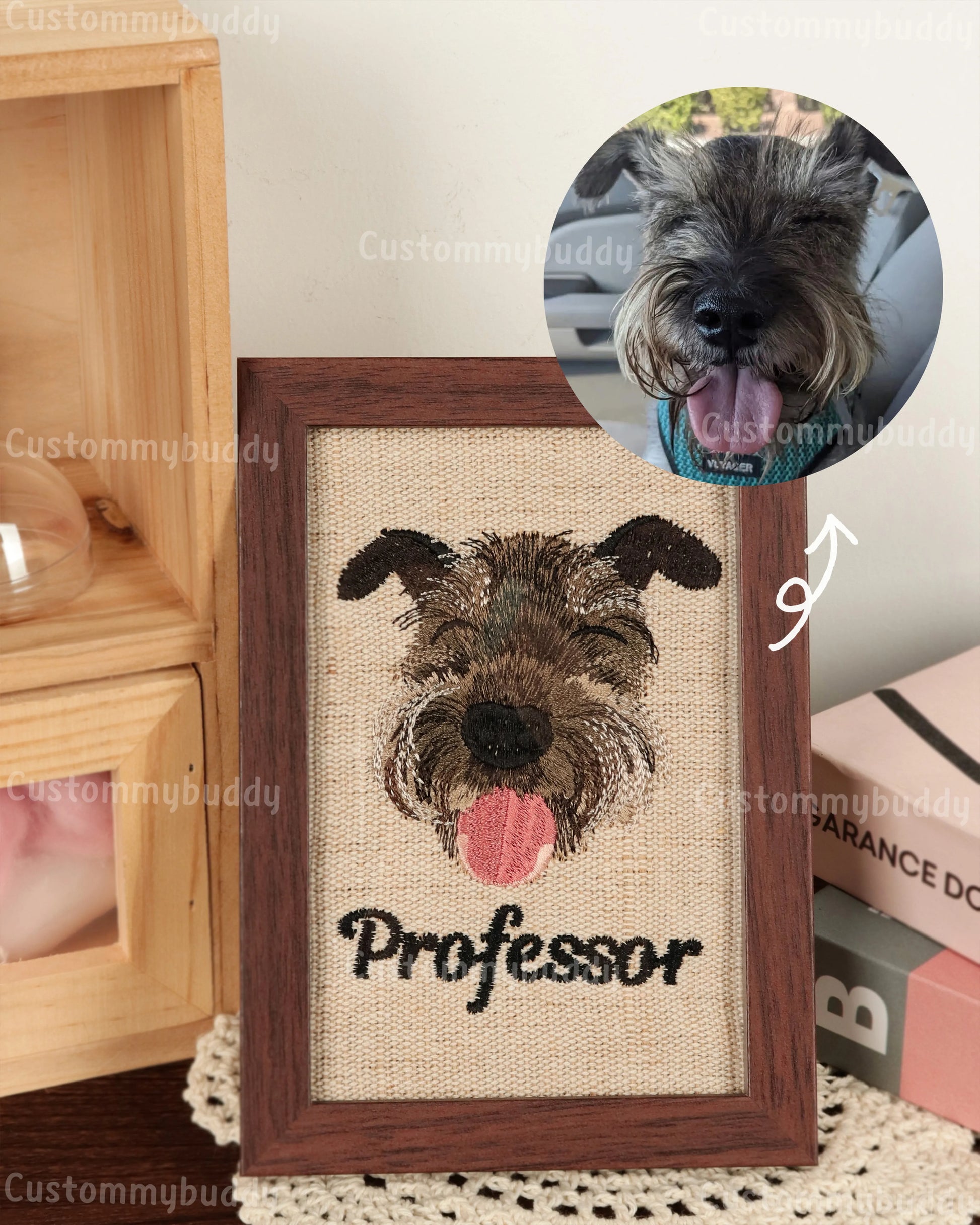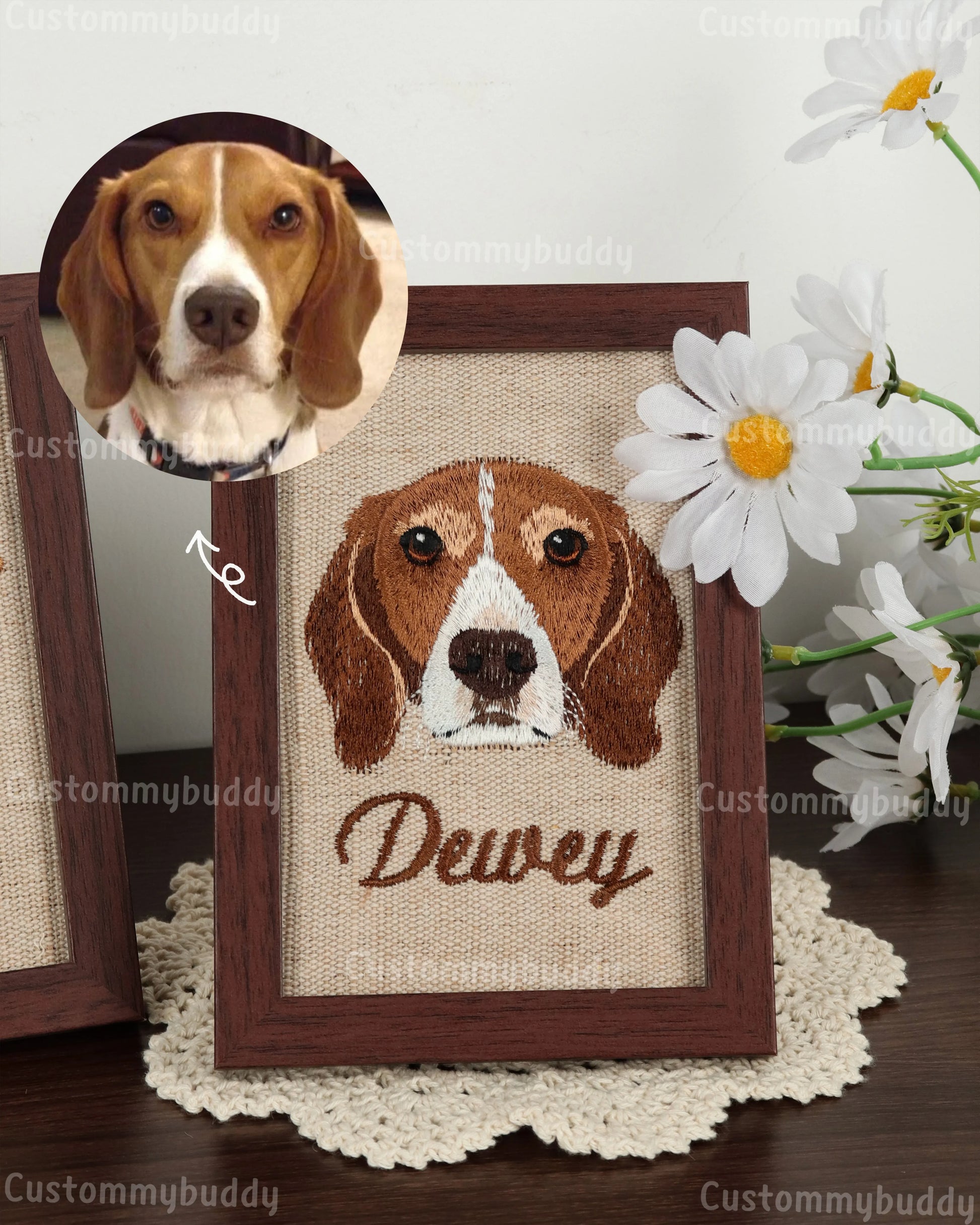 Celebrate your beloved pet with a realistic hand-embroidered portrait, custom-made to capture every detail — from fur texture to soulful expression. Framed in a warm walnut wood frame, this piece brings artful tribute to your home or makes a heartfelt gift for pet lovers.